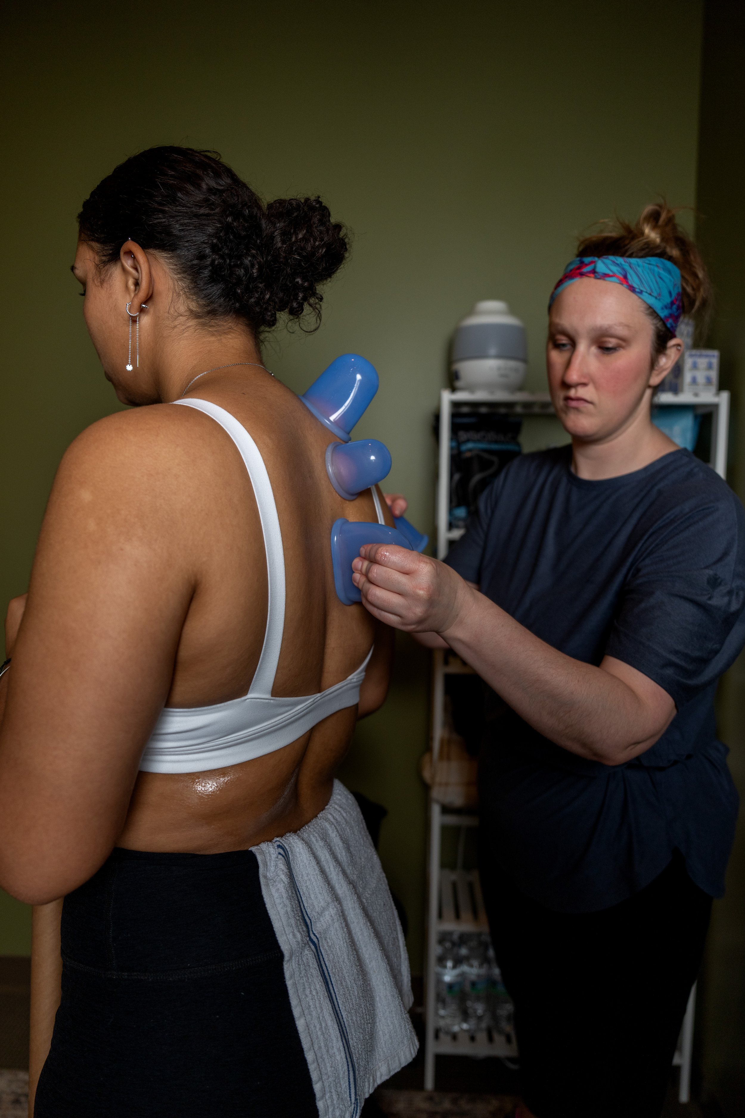 Is used in conjunction with massage to provide suction on the tissues to improve: grip of the muscles and release tension, increase blood flow, move fluids.